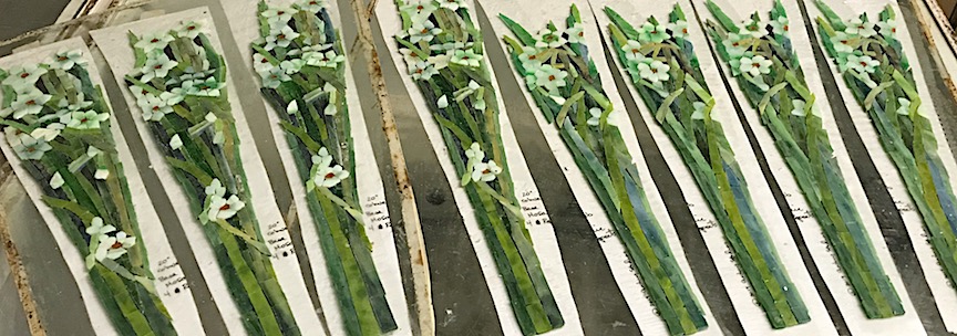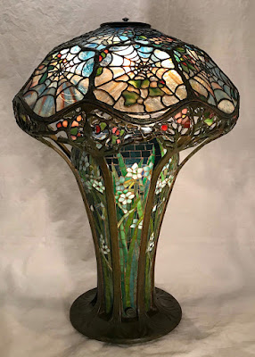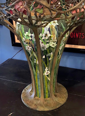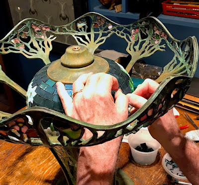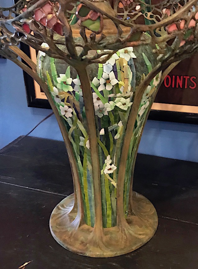 The base is covered in glass mosaic that depicts narcissus growing up between the eight bronze tree supports. While Irwin was soldering on the shade and fretwork, Bill was busy cutting the pictorial mosaic pieces for the body of the lamp base.