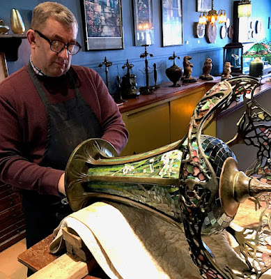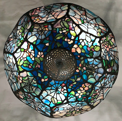 With the 20″ Cobweb shade completed, we continued on with finishing the base. The upper portion of the base has a fretwork canopy of cast bronze branches that splay out from the main body and form the support for the shade. Within this fretwork, glass flowers and leaves are interspersed. This ingenious design element not only physically supports the shade, but it visually connects the shade to the base, blending the two elements into a seamless sculptural piece.