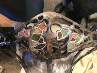Bill meticulously fit and cemented each piece of glass mosaic to the base. In the photo above, the floral portion of the mosaic has been completed.