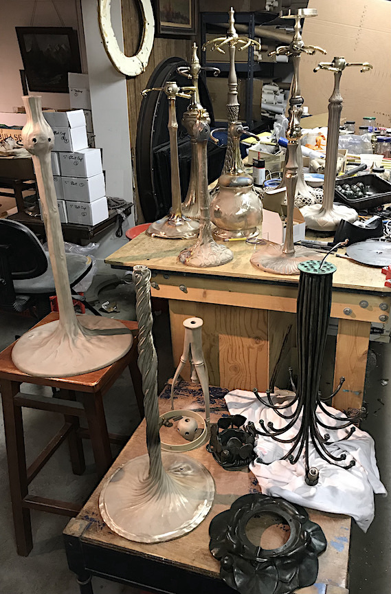 Here is a peek at our work table on the lower level of our studio with bronze castings at various stages of completion. Some bases have their light clusters already completed and are awaiting patina and finishing. The 18 Light Lily table lamp in the foreground has had its patina and is in the process of being wired. After snapping the photo, many of these bases returned to their holding stations so we could clear the end of the table in order to continue working on the pieces.