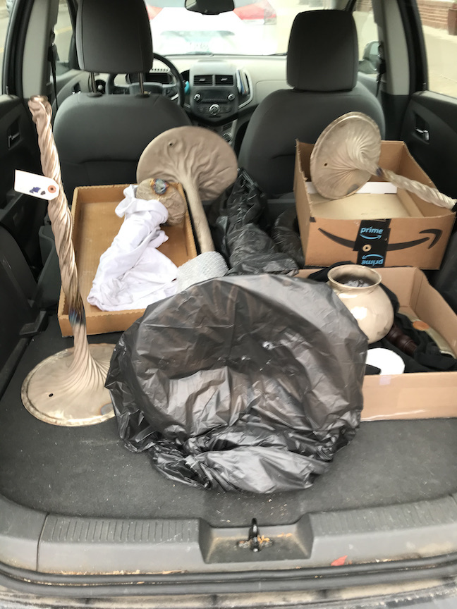 In the above photo, some of the raw bronzes we picked are being positioned in the vehicle for the return journey to the studio. We added a few more castings and padded the pieces against bumping and rolling after this photo was shot. The large central piece in black plastic is the stem for a Bamboo Sr. Floor base.