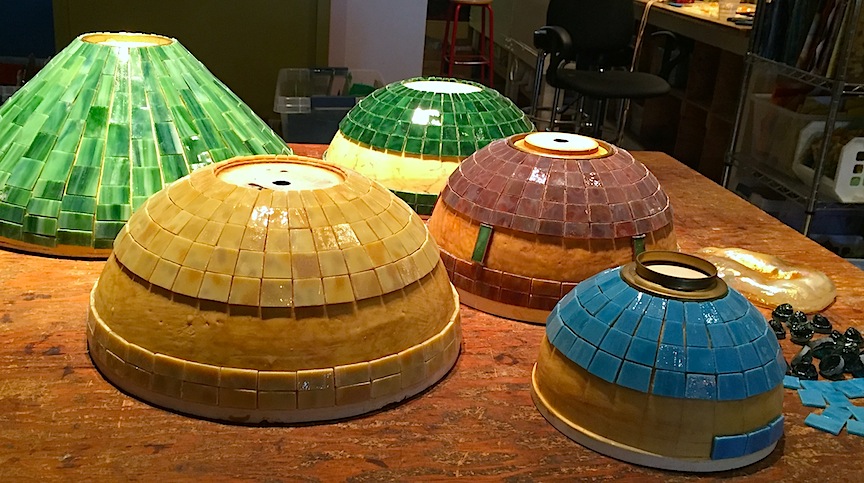 The 7″ shade can be seen along side some of the other geometric shades waiting for completion. The blank spaces on the domes will be filled in with either decorative acorn bands or turtleback tiles.