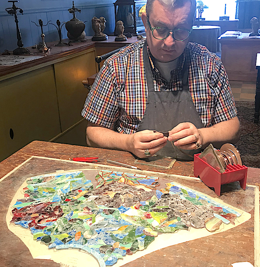 Both Irwin and Bill began foiling on the lamp, but Irwin then moved on to cutting and fitting two 16″ Geometric shades while Bill completed the foiling.