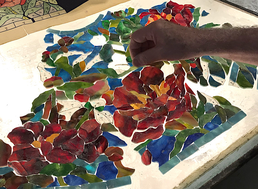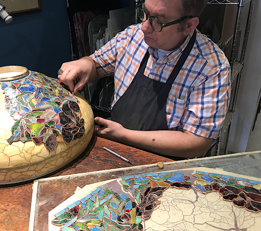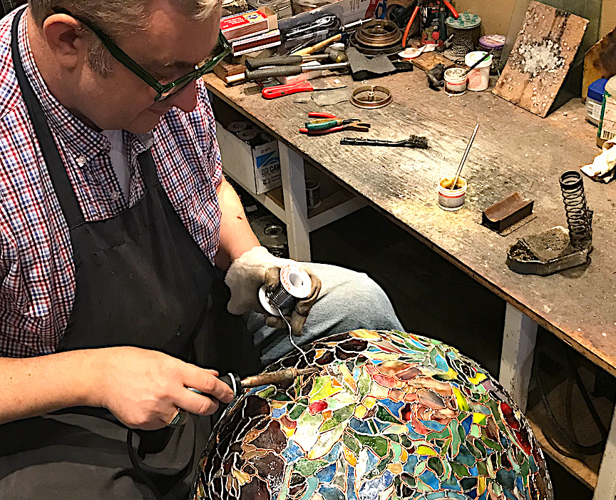While the foiled pieces were transferred onto the form by Irwin, Bill switched to patina work on two lamp bases for upcoming shades.