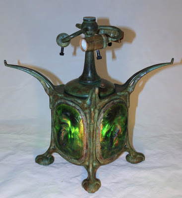 Commissioned in 2016 by a couple in Illinois, this 16″ Turtleback shade is shown on the distinctive Square Turtleback base. The base is cast in bronze at our studio using molds taken from an original Tiffany Studios example and is illuminated from within.