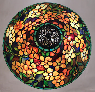 For this 18″ Alalamander shade, a variety of deep orange, amber and yellow flowers are contrasted against a backdrop of purple and blue that is tinged with yellow. The green leaves and stems enliven the rich tones of the background, playing off the border rows at the top and bottom of the shade. The shade is shown on the stately Library base (22.5″ tall). This lamp was created in 2019 as a studio showroom piece and is now in a private collection.