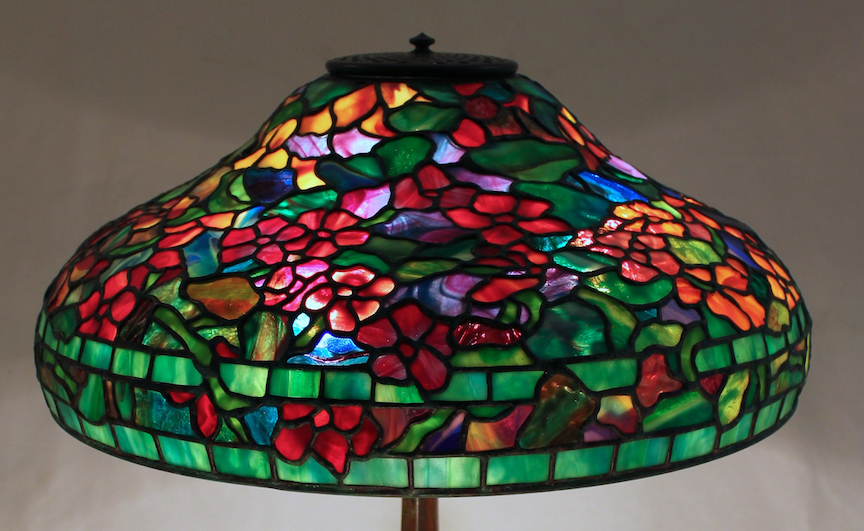 The background of the nighttime side is made up of deep blue and purple fracture/streamer glass. The deep red velvet tones of the flowers mix with more intense oranges and purples. Shown on the Small Stick base (20″ tall), this lamp was created as a showroom piece in 2016 and is now in a private local collection.
