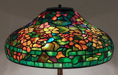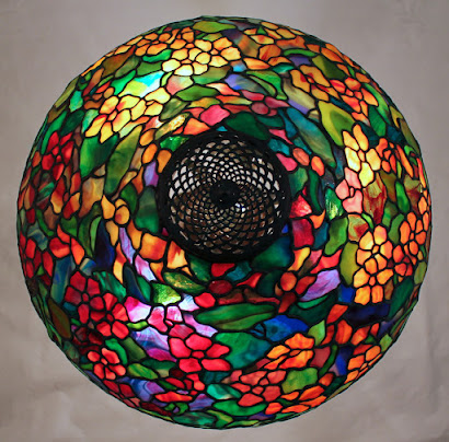 The glass for this intensely colored shade was painstakingly chosen so that the colors blend and shift to create a night and day effect. Rippled and granite textured glasses are sprinkled throughout the shade.