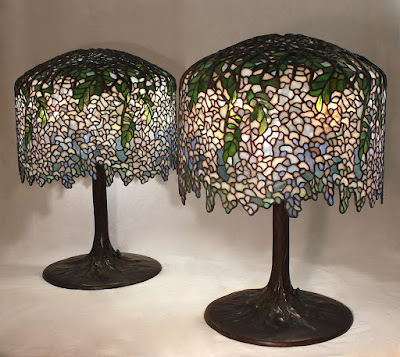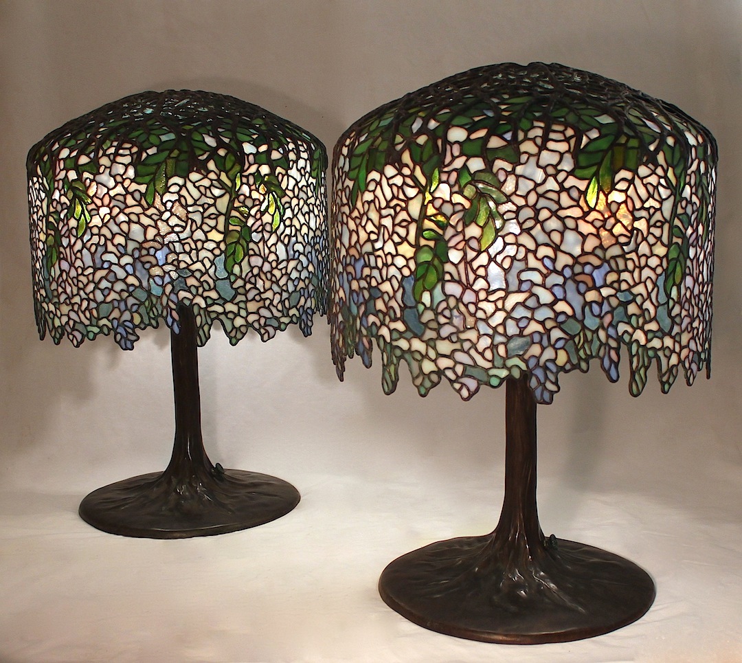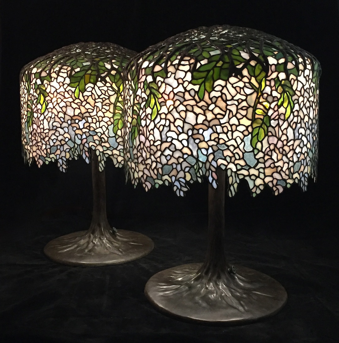 The iconic 18″ Wisteria is one of Tiffany Studios’ signature lamp designs. The crown of cast bronze branches at the top of the shade supports cascading flowers that finish with a naturalistic undulating lower edge. Designed to mate with the Tree Trunk base (23″ tall) this impressive shade has 1945 individual pieces of glass. Traditionally rendered in blue tones, we were commissioned in 2017 to create a matching pair of lamps with white as the predominant color. Hints of lavender and light blue playfully intermingle with the white flowers and green leaves throughout the shades.