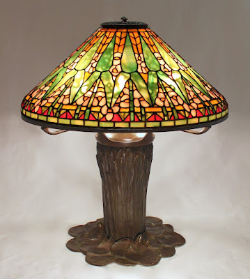 The 20″ Arrowhead shade has a distinctly arts and crafts feel to the pattern. This design has a fairly unique Tiffany Studios approach – representational, yet stylized and rhythmic in its execution. Arrowhead plants can be found near ponds and streams, and the distinctive shape of the foliage is used stylistically to great effect. A sunset orange sky at the top sets the color tone for this shade and warm tones were chosen for each elements throughout the shade. Shown on the sculptural Cattail base, this shade was commissioned by a client in Texas in 2011.