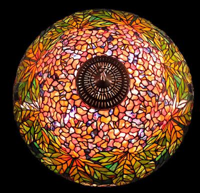 The 22″ Chestnut is a Century Studios’ interpretation of a Tiffany Studios shade design which does not appear to have been produced. A Tiffany Studios salesman’s sample panel showing one pattern repeat is in the collection of the Morse Museum in Florida and appears in several books. Using a photograph of the panel and general measurements as our guide, we decided to create the shade as a 22″ modified turban shape. The shape fit the pattern well and at the 22″ shade size the flowers and leaves appeared to be life sized – something that is common in most Tiffany floral shade designs.