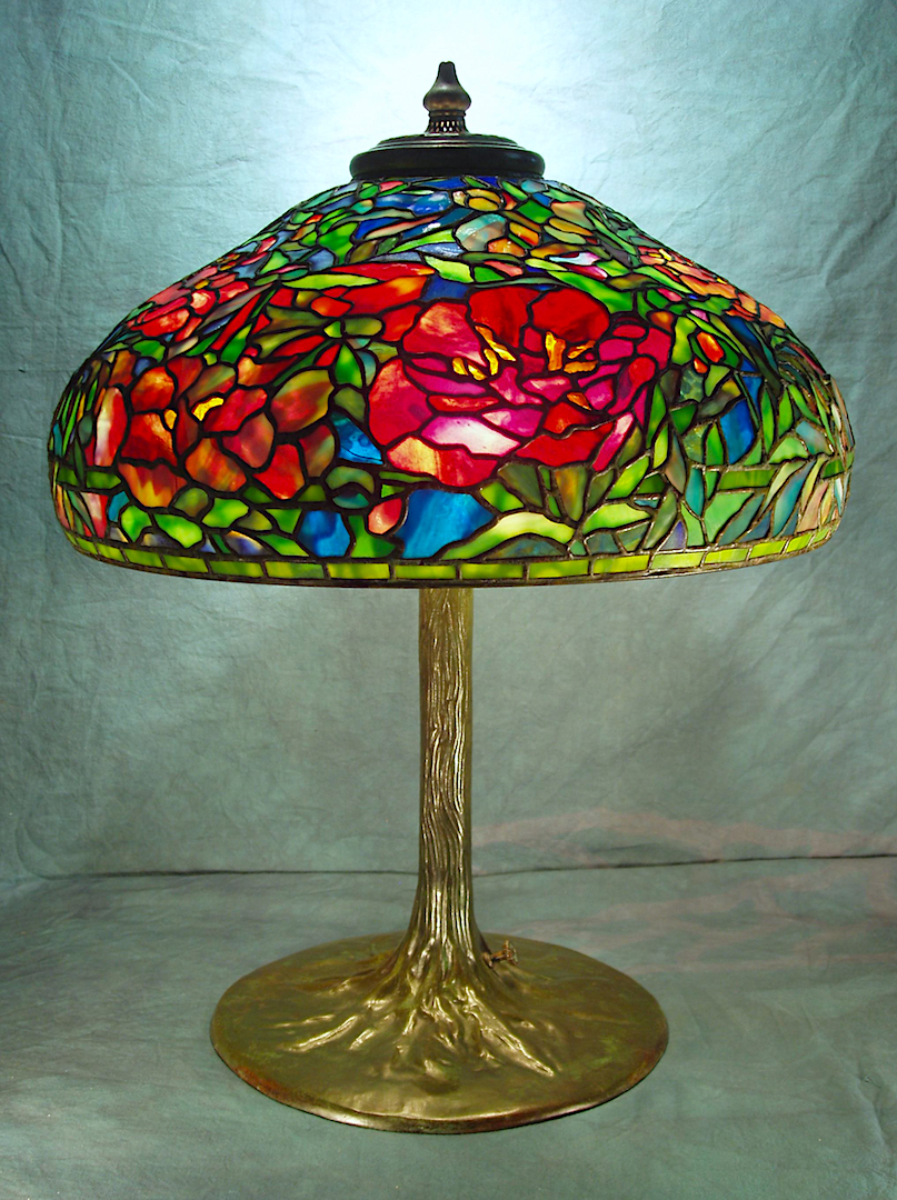 With its intricate piecework and the suggestion of movement, the 22″ Elaborate (or Windswept) Peony is aptly named. The generous scale of the shade allows the glass artist to explore the Impressionistic nature of the design. As a challenge to ourselves, we decided to make this lamp with a two sided color scheme. One side of the shade has fuchsia and orange colored flowers set against a predominantly green background. The colors are blended so that as the shade is spun, the opposite side reveals red flowers against a vivid blue background. Displayed on the sturdy Tree Trunk base, we created this lamp in 2005 as a showroom piece and it now resides in a private collection in Florida.