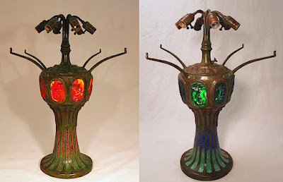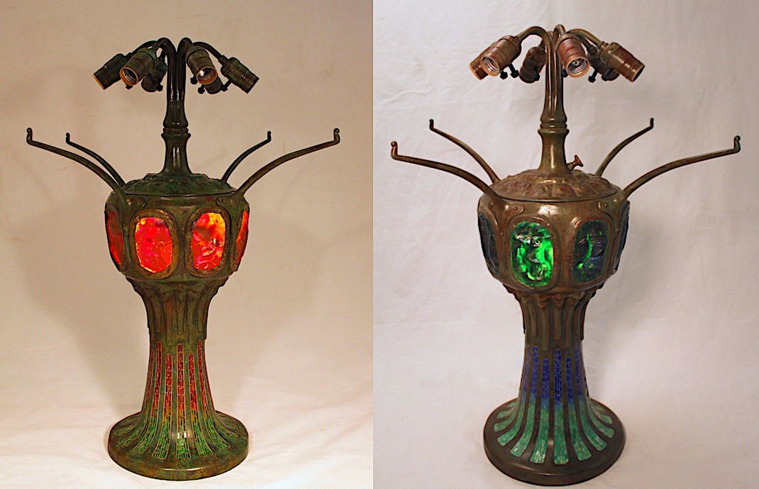 After receiving the base, our client christened it, “The mother of all bases!” We couldn’t agree more that this large base has all the bells and whistles. The band of turtleback tiles is illuminated from within, while the mosaic on the lower portion is viewed in reflected light. We can create this base with green, gold or red turtleback tiles. The glass mosaic on the lower half of the base can be done in any color.