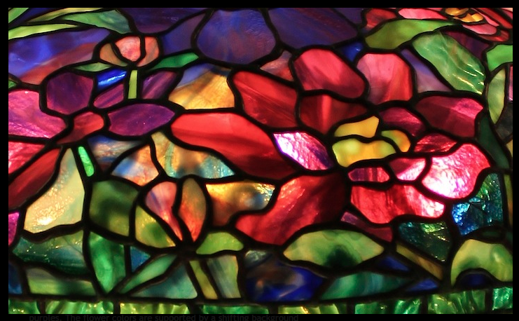Blending together a delicious mix of colors, the flowers are a mix of fuchsia, red, and purple. Lush green foliage parts to reveal a background in an impressionistic mix of deep blue and green, highlighted with amber, purple, red, and fuchsia. Textured glasses are used throughout the shade culminating in the heavily rippled border rows. We created this shade in 2018 for a client in Illinois. The shade is shown on the Twisted Vine base (26″ tall with a large riser).