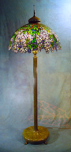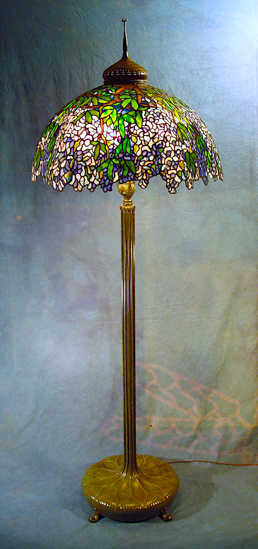 The generously proportioned 28″ Wisteria makes an impressive floor lamp or chandelier fixture. For this shade we used a mix of blue, lavender and white blossoms intermingled with fresh green foliage. The mottled glass gives the flowers a sun dappled appearance, while the irregular lower border and lobed shape creates a naturalistic look. Shown on the Sr. Floor base, this lamp was created in 2007 as a showroom piece and is now installed as a chandelier fixture in a local collection.
