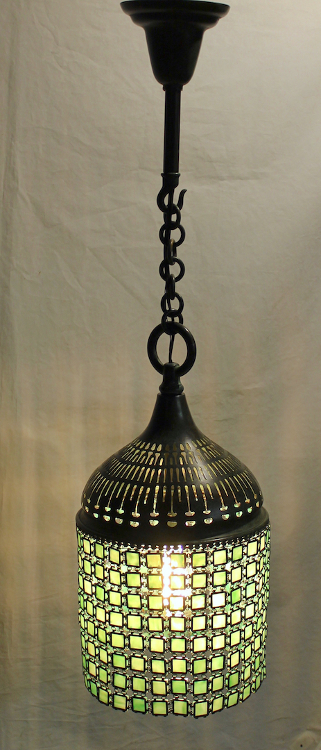 One of the more unusual hanging fixtures designed by Tiffany Studios is the Chain Mail Lantern. The look of the fixture is equally Moorish, Medieval, and Modern. The lantern itself is 9″ wide and has 8 rows of chain mail. The fixture is shown at 33″ in length, and can be made longer with the addition of more chain. The minimum length of the fixture is 25″. We can create Chain Mail with any color of glass.