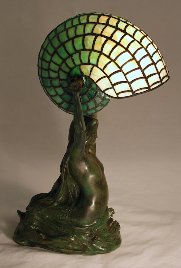 The Mermaid with Nautilus Shell lamp depicts a bronze double-tailed mermaid riding the crest of a wave while holding a lit nautilus shell above her head. Tiffany Studios used the nautilus shade on a few different bases, but this has always been the most coveted shade/base combination. The color of the shade gently shifts from white to green. This lamp was commissioned by a local client in 2016.