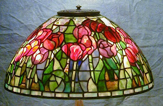 During the course of their production, Tiffany Studios occasionally made adjustments to their lamp patterns. A good example of this is the 16″ Tulip and 16″ Tulip Field shades. At a glance, the two shades appear to have the same design, but the Tulip Field has a denser cluster of flowers at the top of the shade. It can be assumed that the pattern was simplified after its initial design to ease production. At Century Studios, we offer both versions. The Tulip Field shade, shown on the Library base, was created as a showroom piece in 2010 and is now in a private collection.
