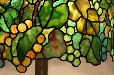 The 18″ Grape is one of four Tiffany tree style lamp designs we offer. The pattern has a pleasing directness that makes a bold statement. We created this example in 2014 blending together a variety of glasses that include fracture/streamer, ring mottle, streaky, striated, and textured. From a short distance, the overall tone of the shade is spring green, but upon closer observation, the shade has a rainbow of subtle color tones harmoniously mixed together. The cast metal sculpted crown at the top of the shade mates with the sturdy Tree Trunk base. This lamp is in a private local collection.
