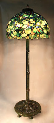 The irregular lower edge gives this design the natural feel of a large specimen with branches bent by flower clusters in full bloom. A wide variety of glasses were used to create this shade. Vibrant greens play against white and off white flower clusters. Hints of blue and purple dot the sky visible through the dense foliage. We created this shade for our showroom in 2012. Shown on the Bamboo Senior Floor base, this lamp is in a private local collection.