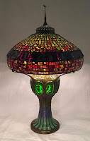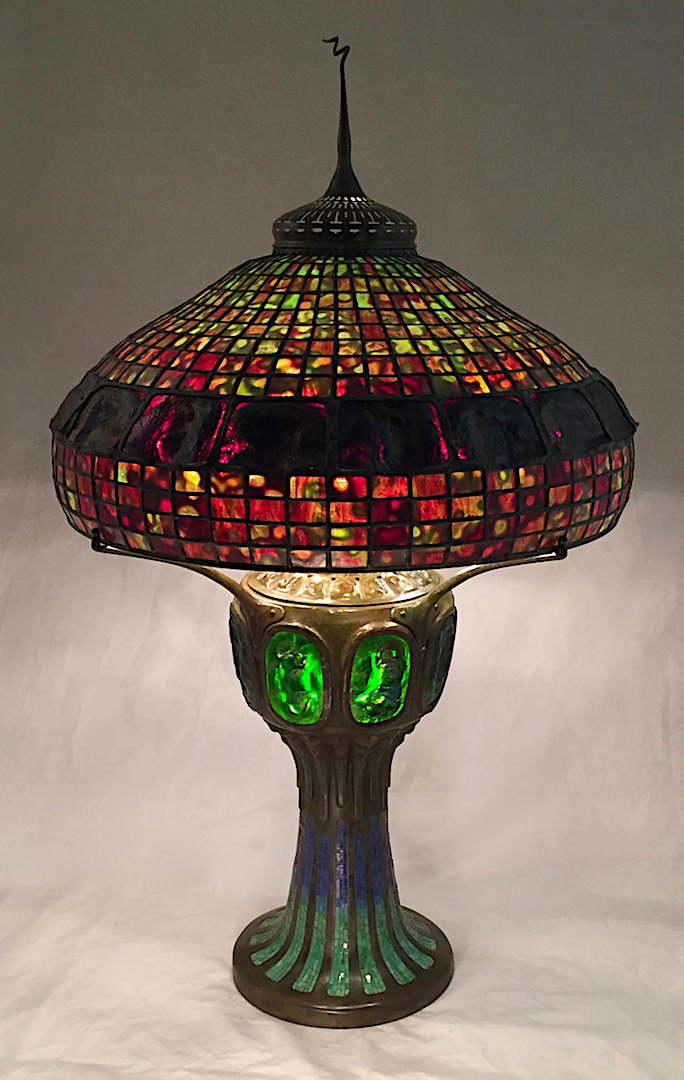 We recently completed a Turtleback Mosaic base. The heavy bronze casting has a band of green turtleback tiles around the upper portionĀ that are lit from within, and glass mosaic on the lower half. The finely detailed glass mosaic shifts from blue down to green and the process of hand cutting and fitting the mosaic takes almost two weeks to complete.