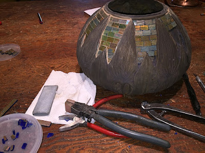 We began the process by researching photos and viewing an original base. There were many steps involved in making our adaptation of this lamp base, beginning with creating the gourd shaped blank on which to sculpt the leaves. Many hours were spent sculpting in clay and wax, and multiple intermediate molds were needed before we arrived at our final version. Once the body of the base was cast in bronze, iridescent glass mosaic tiles were cut and fit for the spaces between the leaves. The bronze was then given a patina and the shade support and electrical elements finished. The Arrowhead Mosaic Urn base works with any 16″ shade.