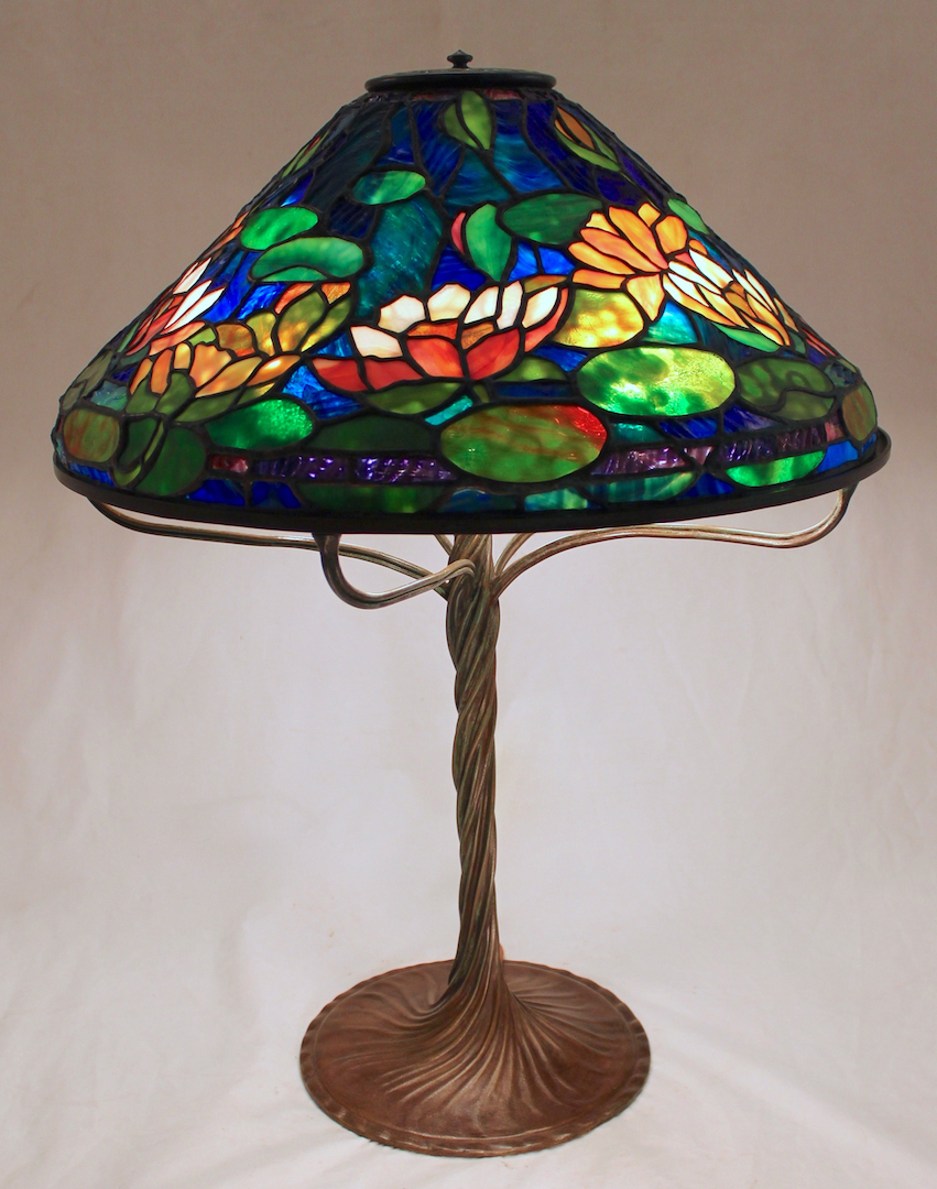 Century Studios is pleased to introduce a new lamp base to our offerings, the Twisted Vine with Arms. This variation on the popular Twisted Vine base has five vine-like arms reaching out from the central stem to the cast shade support ring. The addition of the arms and ring transforms the lamp into a visually integrated unit, blurring the lines between base and shade. This look personifies Tiffany’s early philosophy of lighting design in which individual pieces are treated as illuminated sculptures that become focal points in an interior