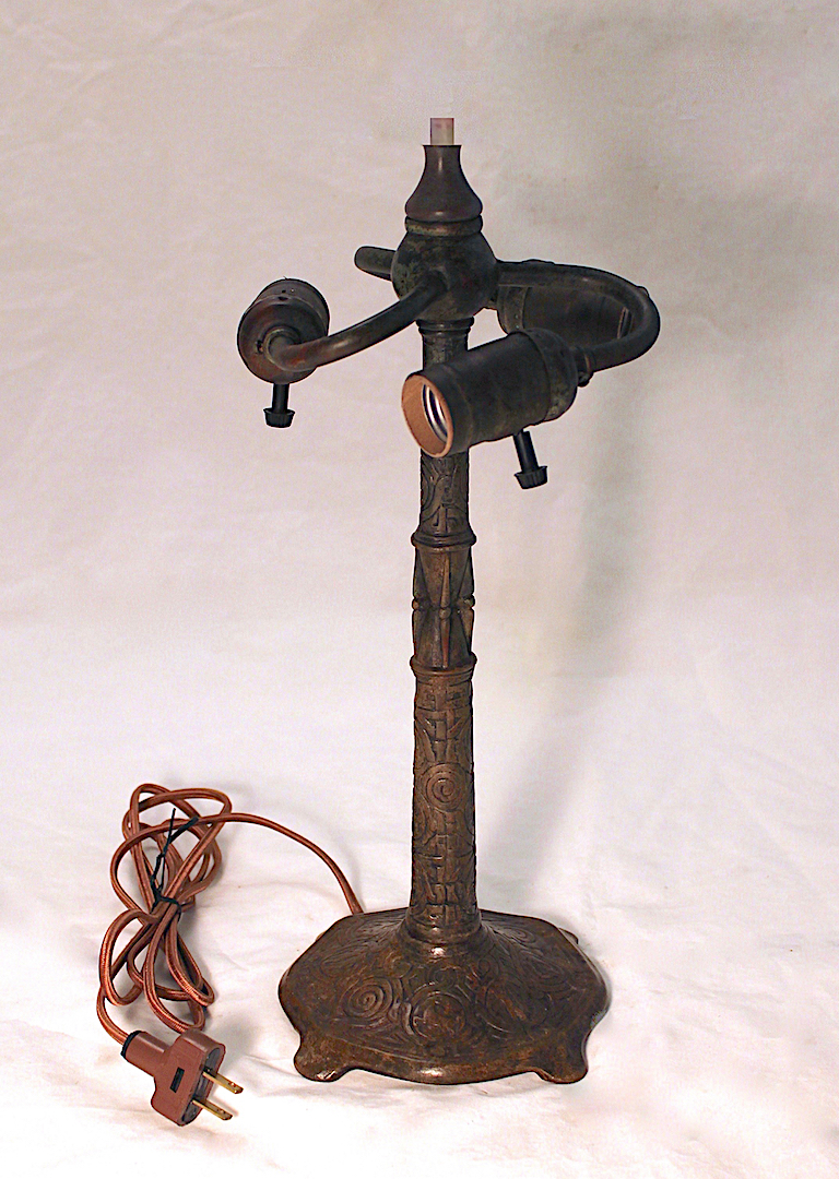 Tiffany Studios created desk set accessories in many patterns, and often included small lamps to round out the sets. With over thirty individual pieces (each sold separately), the Zodiac pattern was one of the most popular of the desk set designs and included four different lamp options to round out the set – a Banker’s style lamp, a Harp style lamp for use with blown shades, a Turtleback Lantern style lamp, and this Traditional style lamp base which could be used with multiple shades. Taking our molds from an original example, we are pleased to now include this versatile base in our line of reproduction Tiffany lamp bases. The Zodiac base will work with any 12″ or 14″ shade.