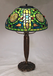 The 12″ Zodiac shade is a Century Studios original design. Using design elements from the Zodiac desk set and also Tiffany Studios’ 22″ Zodiac shade, Bill Campbell created this shade to fit harmoniously on the Zodiac base. The shade features pressed glass jewels surrounded by a Celtic motif of undulating border rows which divide the shade into quadrants. For this example, green and blue border rows encircle amber/yellow glass panels and jewels.