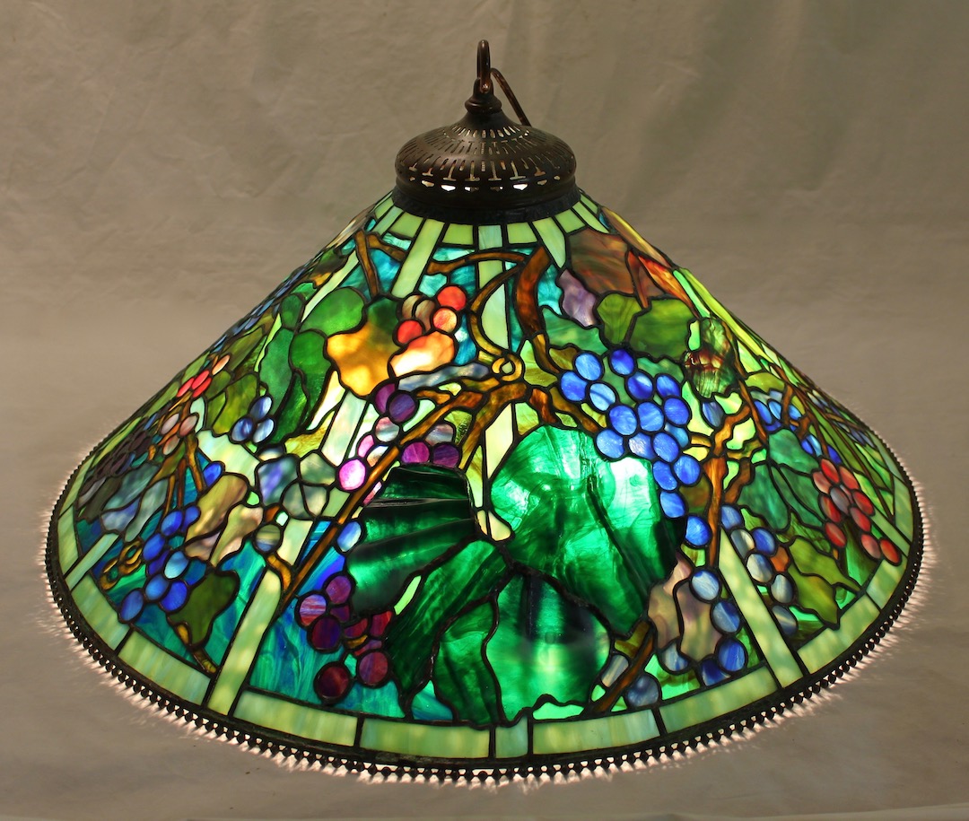 Century Studios is pleased to introduce a new design to our line of reproduction Tiffany lamps, the 28″ Grape Trellis. Designed by Tiffany Studios as a chandelier fixture, the shade can also be used as a floor lamp or oversized table lamp. This exciting new lamp is currently available in our showroom.