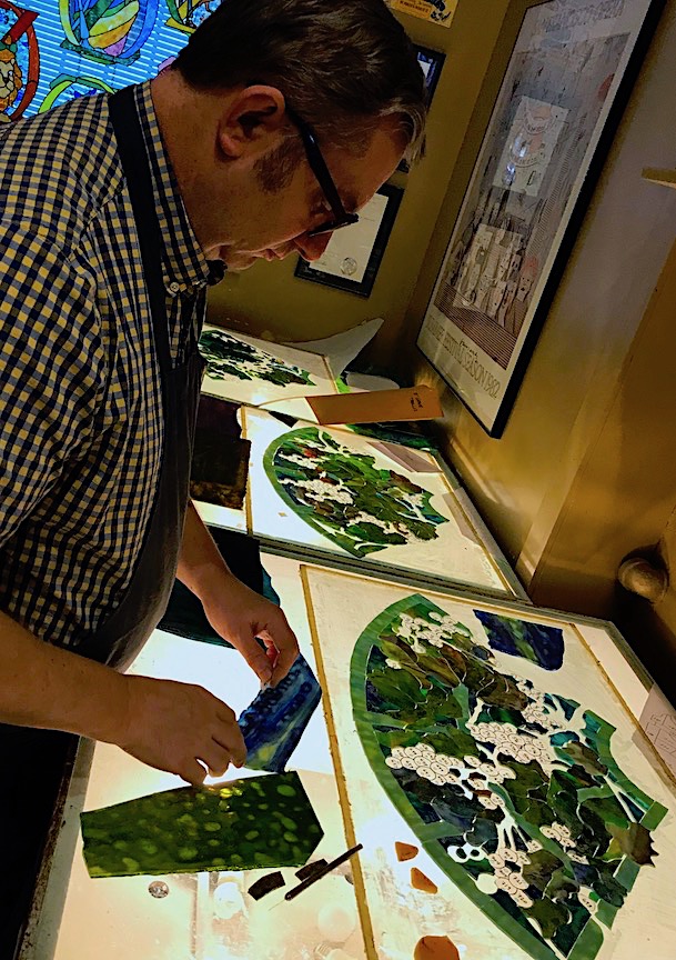 Once all the glass was selected, cut and fit, the pieces were foiled and then transferred onto the form.