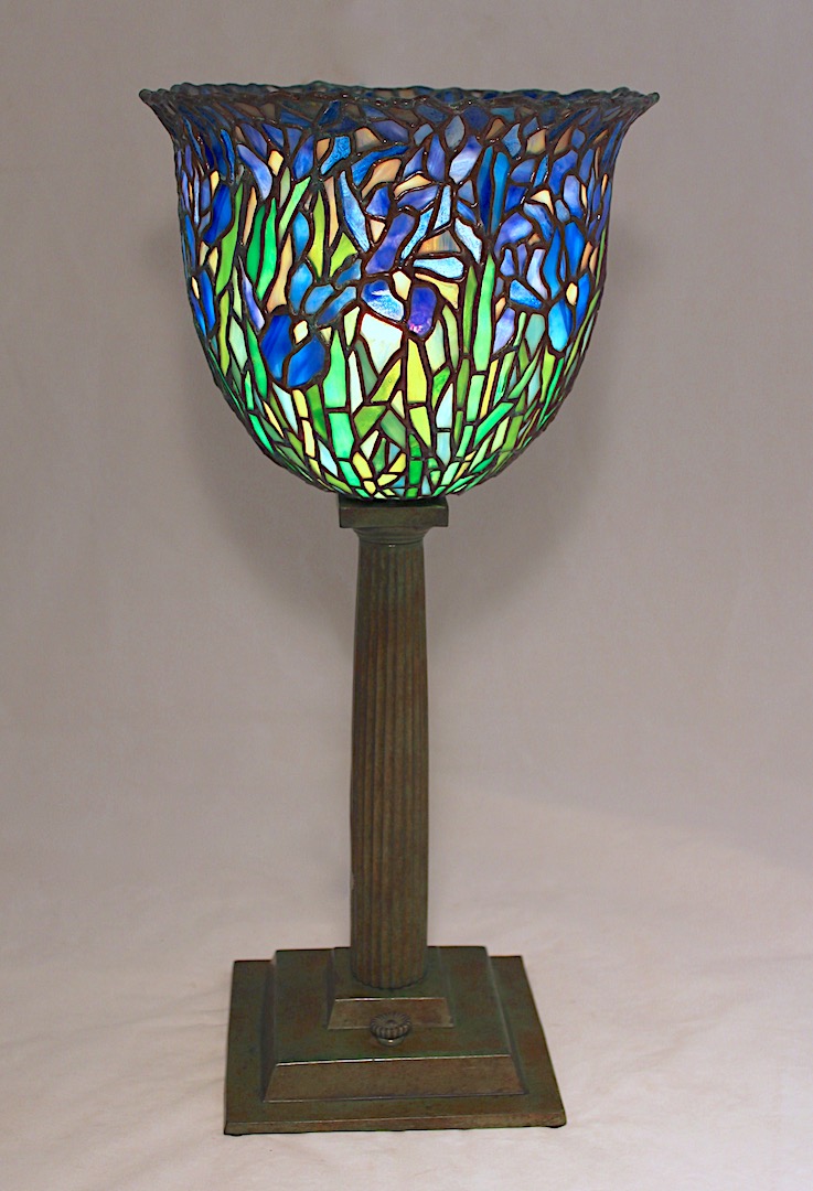 Intended for use as a table top torchiere lamp, the shade is shown on the elegant Doric Column Torchiere base. The classic lines of the column echo the straight stalks of the flowers in the shade. This lamp is currently available for purchase in our showroom.
