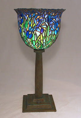 Century Studios is pleased to present an new original lamp design – the 9″ Iris shade. Designed by Bill Campbell, this petite shade is covered in Iris flowers clustered together in a impressionistic melange of color. Blue and purple iris mix together with lively green leaves and stems. The irregular upper border of the shade adds an additional naturalistic detail.