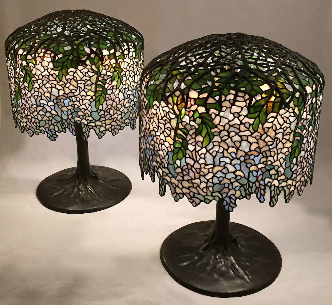 After several months of dedicated work, we have completed the pair of matching white 18″ Wisteria lamps. These elegant lamps were commissioned by an international client.