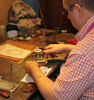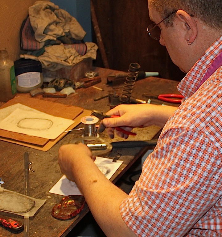 Using the lost wax casting method, we cast this base in bronze using molds taken directly from an original Tiffany example. Once the raw castings are completed, Bill created the glass mosaic around the bottom of the base. The glass mosaic can be done in any color combination. For this base, our client requested a color transition from red to green.