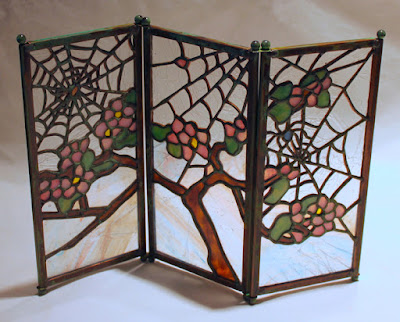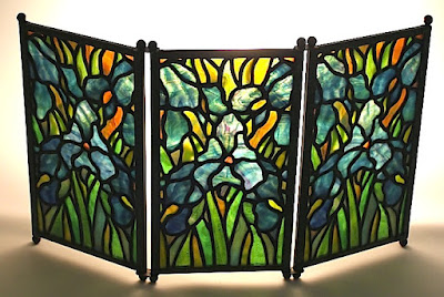 We have a client in North Carolina who has recently commissioned two reproduction Tiffany Table Screens. Table Screens, often called Tea Screens, are three panel, miniature stained glass windows which are hinged to stand in several configurations. The first screen features blooming Iris. The lively floral panel design is repeated three times.