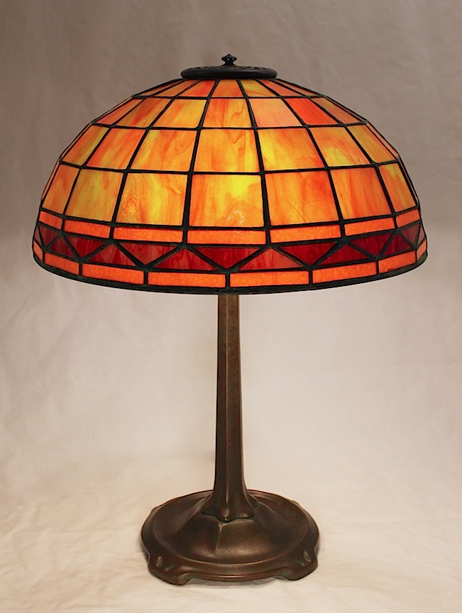 In between some larger floral shades, we recently completed several geometric shades. The 7″ Geometric shade was made from a deep red glass. This shade was created for an antique Student Lamp base. Originally a shiny brass oil lamp, the base has been electrified and we applied a verdigris patina to the piece. This complete lamp is currently available for purchase in our showroom.