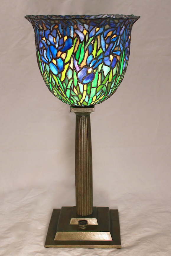 9″ Iris – This is a Century Studios original shade design. This torchiere style shade is covered in delicate Iris flowers clustered together in a impressionistic burst of color. The shade is shown on the Doric Column Torchiere base.