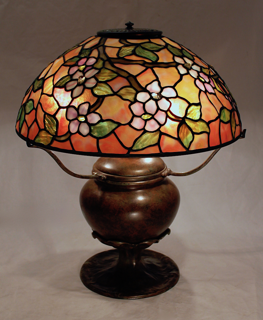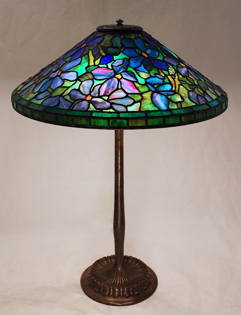 18″ Clematis – This beautifully designed Tiffany shade has a non-repeating pattern and is covered in large flowers. Purple and blue flowers tinged with fuchsia are set against a green fracture glass background. In addition to ring mottled and streaky glass, rippled glass appears throughout the shade in the flowers, leaves, and flower centers. Much of the glass used for this shade was made by the Lins and Schlitz glass foundries. Both of these glassmakers ceased production in the 1990’s, and their glass is highly prized. The shade is shown on the tall Grooved base.