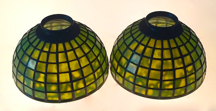 This pair of 7″ Geometric shades in a light green mottled glass were commissioned by a local client to be used on an original Tiffany Studios double student lamp.