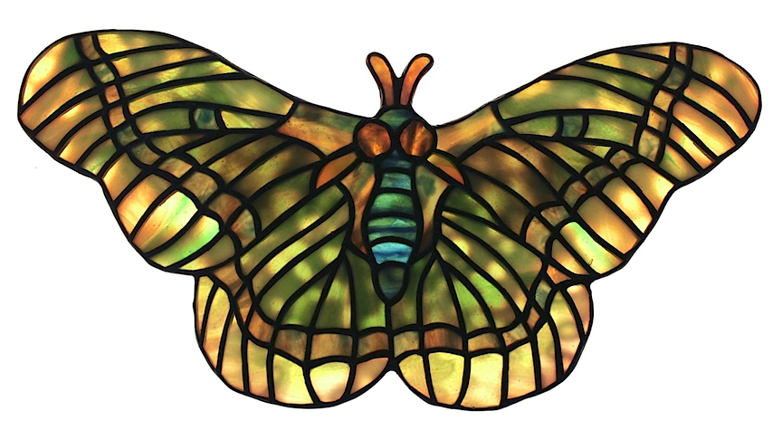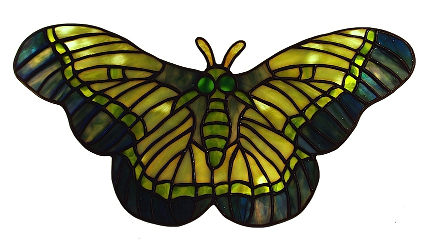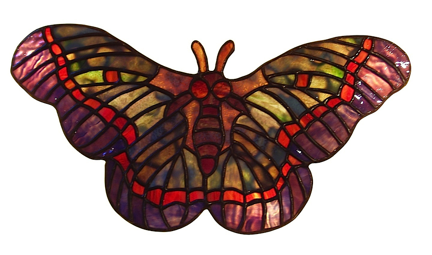 At Century Studios, we make many Suncatchers including this collection of reproduction Tiffany Studios moths, butterflies and dragonflies. These were originally designed as “light shields” which were intended to be hung from the firm’s stained glass shades to shield the light bulb from a person sitting near the lamp. All of these designs can be created in virtually any coloration, and we are showing several examples below.
