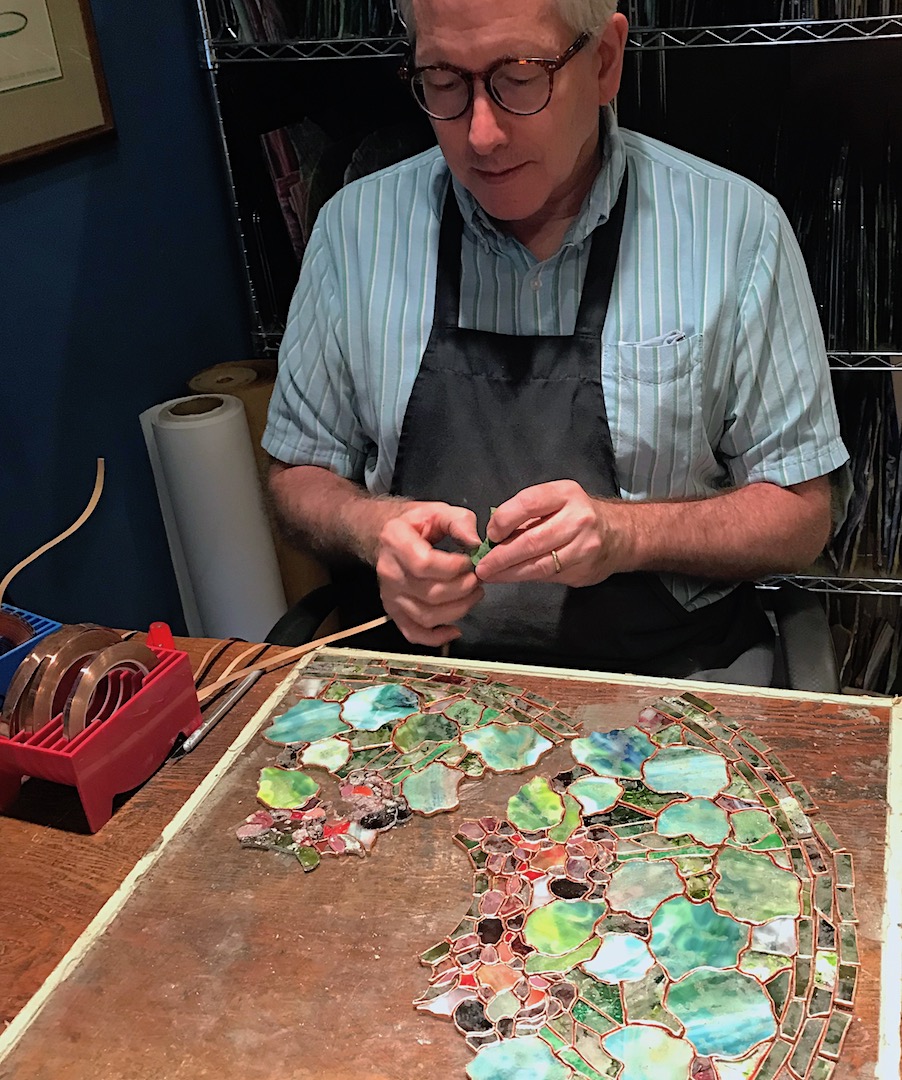 At Century Studios, we always have more than one project being worked on at any given time, and the past two weeks found Bill Campbell and Irwin Terry working on two different 16″ shades and completing several lamp bases. While Bill did the layout on a 16″ Dragonfly shade, Irwin worked on putting together several lamp bases. Completing the metalwork, Irwin then joined Bill to foil the Dragonfly shade and began working on soldering the shade.