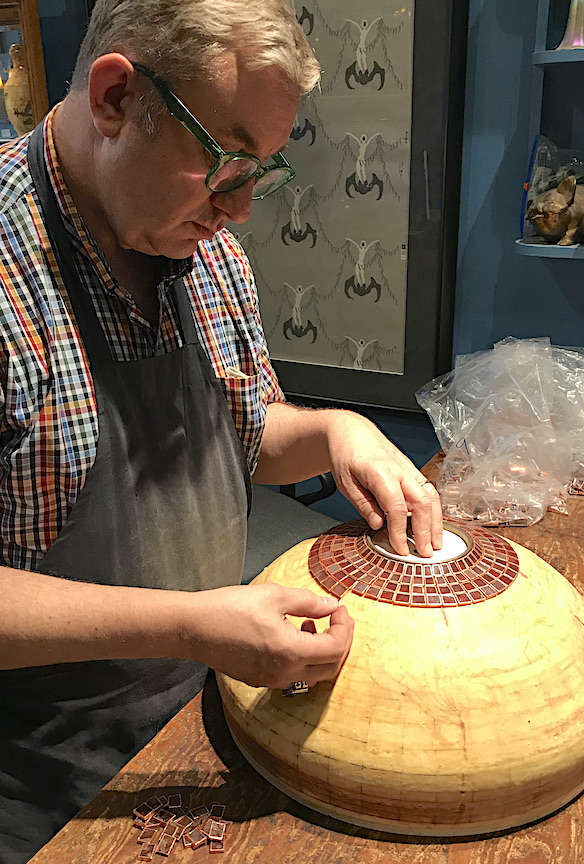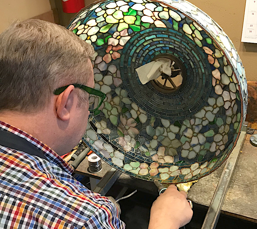 This past week was a busy one at Century Studios with multiple projects happening at the same time. While Bill was foiling the 22″ Dogwood, Irwin was cutting and fitting an 18″ Geometric Turban shade. Once the Geometric was completely cut and fit to the form, we removed the pieces and Bill began foiling the lamp. Bill also spent time applying the patina to the Library base that will be used with the 18″ shade.