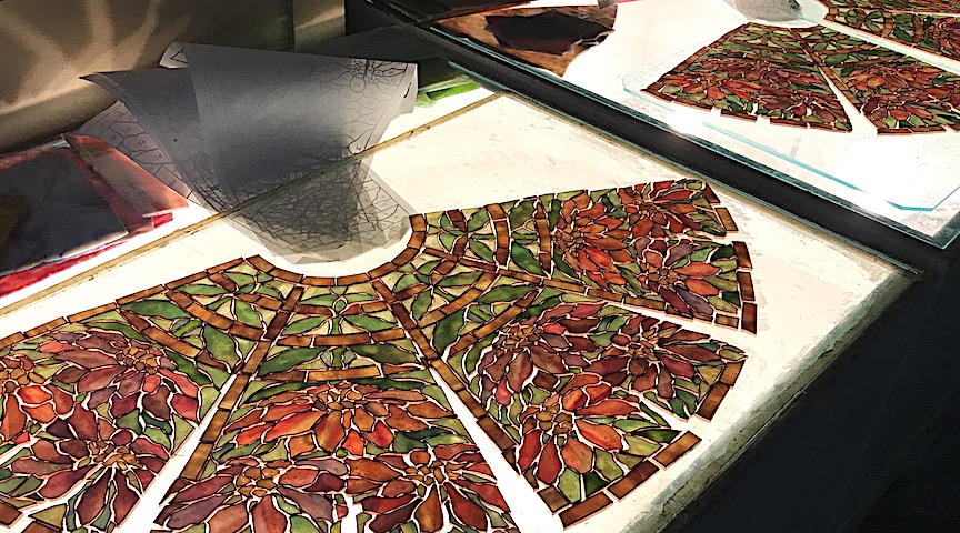 We are busy at the studio working on two large shades for different clients – a 22″ Poinsettia and a 22″ Trumpet Vine. The glass shown in the first photo is under consideration for the trumpet vine. The poinsettia is shown laid out on the light table before being transferred onto the form. Irwin has been soldering on the poinsettia this week and the shade is nearing completion, while Bill has been working on the trumpet vine layout.