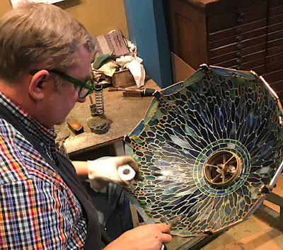 In addition to finishing several commissioned lamp bases and fixtures, we are also coming close to completing a 22″ Dragonfly shade for a client. Irwin is shown soldering the interior of the shade which will be completed soon. Waiting in the wings, we have a large geometric shade foiled and ready for soldering once the dragonfly is completed.
