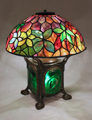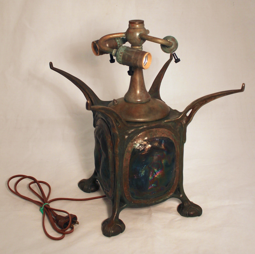 The bronze base has four large turtleback tiles that can be illuminated from within. The 16″ Woodbine shade shown in the photo is available for purchase from our studio.