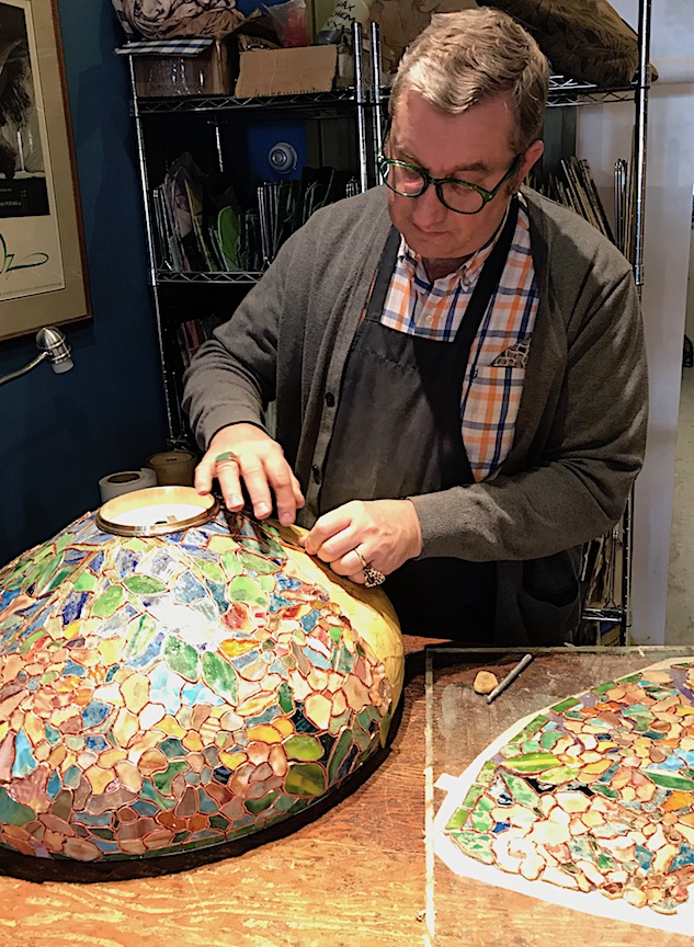 This week at Century Studios we were busy working on several projects. Bill completed the layout/cutting/fitting for the 22″ Trumpet Vine shade and the next step of foiling all the pieces began.