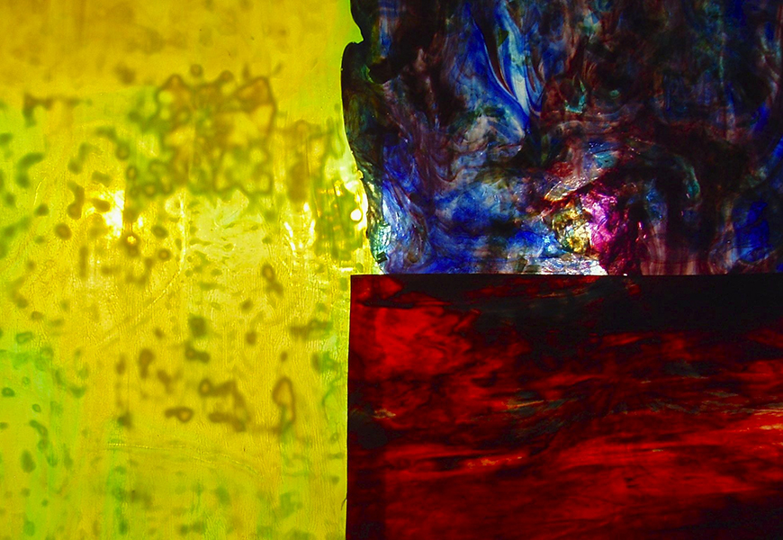 The cut pieces are laid out on a piece of glass and examined on the light table. This flat layout is studied and adjusted until all the pieces of glass are cut and fit and the artist is satisfied that the coloration is correct.